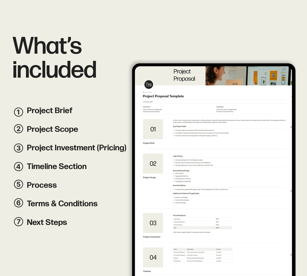 A sleek, preformatted Notion page designed to present your project scope, deliverables, timelines, pricing, and terms in a professional layout.